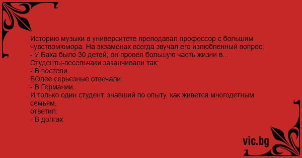 Историю музыки в университете преподавал профессор с большим чувствомюмора. На экзаменах всегда звучал его излюбленный вопрос: