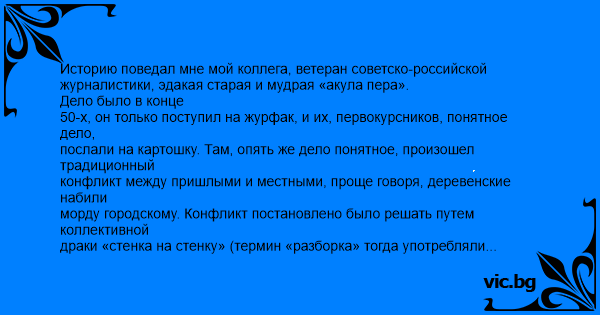 Историю поведал мне мой коллега, ветеран советско-российской журналистики, эдакая старая и мудрая «акула пера». Дело было в конце 50-х, он только поступил на журфак, и их, первокурсников, понятное дело, послали на картошку. Там, опять же дело понятное, произошел традиционный конфликт между пришлыми и местными, проще говоря, деревенские набили морду городскому. Конфликт постановлено было решать путем коллективной драки «стенка на стенку» (термин «разборка» тогда употребляли лишь в изначальном значении). И перед битвой, как положено, стороны вначале выставили «закоперщиков», дабы те провели словесную баталию. Деревенских представлял некто Рыжий (это он побил беднягу гаудеамуса), а студентов - парень по имени Пашка. Личность эта была весьма примечательная, в первую очередь потому, что смог поступить в ВУЗ, отсидев до этого два года в тюрьме. Как ему это удалось (да еще в те то годы!) - непонятно: не то амнистия какая вышла, не то еще что. Но факт остается фактом, и сомневаться в нем не приходится - коллега-рассказчик враньем не отличается. Короче, Пашка вспоминает лагерное прошлое и давай собеседника «по фене» стращать: «Да я те, фраерок, пасть порву, моргалы выколю, глаз на ж%пу натяну» - в общем, смотри сцену в камере из «Джентльменов удачи». А еще на курсе был у них паренек Антон - эдакий рафинированный московский интеллигентный юноша, папа - профессор, мама - препод в Консерватории, ни мата, ни «фени» отродясь он не слышал, да и крепче молока ничего не пил. Но тут дорвался до студенческой вольницы, принял лишку (да ему много и не надо было), и в этом состоянии Антон не нашел ничего лучшего, как с усердием попугая повторять за Пашкой все его тирады (ни черта в них не понимая). «Да, да, моргалы порвем, пасть выколем». Перебранка продолжалась: Рыжий огрызался, Пашка угрожал, а Антон дублировал своего оратора. Наконец вся эта словесная фигня Пашке надоела и он выдал последний аргумент: «Короче, фраерок, ща я тя просто «отпетушарю», снимай штаны, «опускать» буду…». И тут Антон опять: «Да, снимай штыны, опустим тебя. Послушай, Паш, но если он штаны снимет, как же его опустим, неудобно ведь? » Битва «стенка на стенку» не получилась. Ибо все «кирпичики» тут же завалились на землю, не в силах не то что руками махать, но и просто на ноги подняться.
