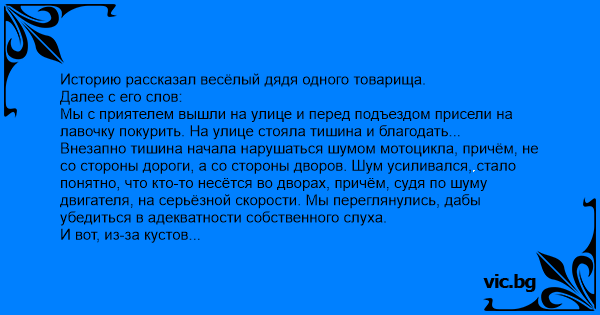Историю рассказал весёлый дядя одного товарища. Далее с его слов: Мы с приятелем вышли на улице и перед подъездом присели на лавочку покурить. На улице стояла тишина и благодать... Внезапно тишина начала нарушаться шумом мотоцикла, причём, не со стороны дороги, а со стороны дворов. Шум усиливался, стало понятно, что кто-то несётся во дворах, причём, судя по шуму двигателя, на серьёзной скорости. Мы переглянулись, дабы убедиться в адекватности собственного слуха. И вот, из-за кустов соседнего двора показался мужик на красной Яве. Видимо, заметив нас он двинулся в нашу сторону даже не думая скинуть скорость. Не успели мы даже сообразить, как он пролетел мимо нас в открытую подъездную дверь и через мгновение выбежал из подъезда, скинул мотциклетные очки в кусты, достал из кармана сигарету, прыгнул рядом с нами на лавку и начал её подкуривать не с той стороны. Мы сидели сохраняя тишину и непонятливо смотря на мужика. Но тишина продлилась не долго - с той же стороны опять раздался шум мотоцикла. Спустя секунду из-за тех же кустов вылетел милицейский наряд верхом на Урале и, опять же, заметив людей поехали в нашу сторону, но уже притормаживая. Остановившись рядом с нами, сидевший на пассажирском месте сержант задал вполне ожидаемый вопрос: - Ребят, вы здесь мужика на красной Яве не видали? Наш новый знакомый затянулся сигаретным фильтром и этой же рукой, зажав сигарету между пальцев, указал стражам порядка направление налево. - Ага! - кивнули полисмены и под рёв Уральского движка скрылись за домами. Прокашлявшись от затяжки угольным фильтром, наш мотоциклист встал и скрылся в подъезде. Хоть мы уже докурили, но встать или заговорить как-то не решались и просто затаив дыхание смотрели в темноту подъезда. Через пару минут из подъезда выскочил наш новый знакомый, вытащил из кустов мотоциклетные очки и вновь нарушил тишину: - Мужики... Это... Помогите мотоцикл со второго этажа спустить... И снова скрылся в подъезде.