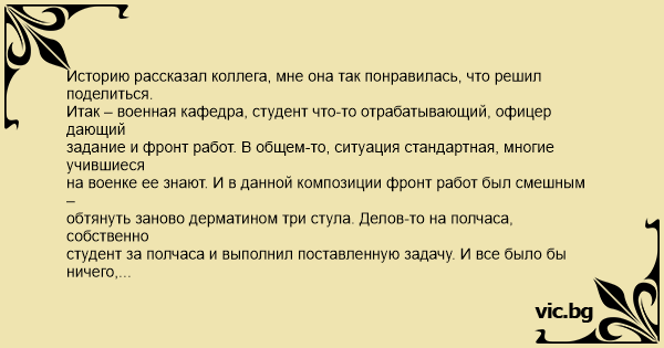 Историю рассказал коллега, мне она так понравилась, что решил поделиться. Итак – военная кафедра, студент что-то отрабатывающий, офицер дающий задание и фронт работ. В общем-то, ситуация стандартная, многие учившиеся на военке ее знают. И в данной композиции фронт работ был смешным – обтянуть заново дерматином три стула. Делов-то на полчаса, собственно студент за полчаса и выполнил поставленную задачу. И все было бы ничего, если бы не особенность дерматина – он был полосатым, а студент был раздолбаем. И получилось, что два стула имели полоски вдоль, а один поперек. Придя принять работу, офицер, увидев три стула стоявших в ряд вдоль стеночки ближе к углу, не проявил благодарности, более того, видя столь вопиющее безобразие, он начал багроветь. Студент заметался. Ему уж точно не хотелось наблюдать инсульт у своего начальства, и он принял гениальное решение. Выбивавшийся из благолепной картины стул моментально был развернут на девяносто градусов, к угловой стенке, и картина полосатости была приведена таким образом в соответствии с эстетическими требованиями заказчика. Кровь оттекла от лица офицера, морщины на его лице разгладились, и он, гаркнув "Молодец", вышел из кабинета.