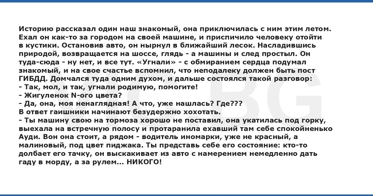 Историю рассказал один наш знакомый, она приключилась с ним этим летом. Ехал он как-то за городом на своей машине, и приспичило человеку отойти в кустики. Остановив авто, он нырнул в ближайший лесок. Насладившись природой, возвращается на шоссе, глядь - а машины и след простыл. Он туда-сюда - ну нет, и все тут. «Угнали» - с обмиранием сердца подумал знакомый, и на свое счастье вспомнил, что неподалеку должен быть пост ГИБДД. Домчался туда одним духом, и дальше состоялся такой разговор: - Так, мол, и так, угнали родимую, помогите! - Жигуленок N-ого цвета? - Да, она, моя ненаглядная! А что, уже нашлась? Где??? В ответ гаишники начинают безудержно хохотать. - Ты машину свою на тормоза хорошо не поставил, она укатилась под горку, выехала на встречную полосу и протаранила ехавший там себе спокойненько Ауди. Вон она стоит, а рядом - водитель иномарки, уже не красный, а малиновый, под цвет пиджака. Ты представь себе его состояние: кто-то долбает его тачку, он выскакивает из авто с намерением немедленно дать гаду в морду, а за рулем... НИКОГО!