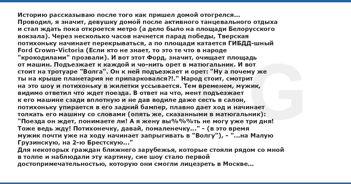 Историю рассказываю после того как пришел домой отогрелся... Проводил, я значит, девушку домой после активного танцевального отдыха и стал ждать пока откроется метро (а дело было на площади Белорусского вокзала). Через несколько часов начнется парад победы, Тверская потихоньку начинает перекрываться, а по площади катается ГИБДД-шный Ford Crown-Victoria (Если кто не знает, то это те что в народе "крокодилами" прозвали). И вот этот Форд, значит, очищает площадь от машин. Подъезжает к каждой и чо-нить орет в матюгальник. И вот стоит на тротуаре "Волга". Он к ней подъезжает и орет: "Ну а почему же ты на крыше планетария не припарковался?!." Народ стоит, смотрит на это шоу и потихоньку в жилетки уссывается. Тем временем, мужик, видимо ответил что ждет поезда. В ответ на что, мент подъезжает к его машине сзади вплотную и не дав водиле даже сесть в салон, потихоньку упирается в его задний бампер, плавно дает ход и начинает толкать его машину со словами (опять же, сказанными в матюгальник): "Поезда он ждет, понимаете ли! А я жену вы%%%ть не могу уже три дня! Тоже ведь жду! Потихонечку, давай, помаленечку..." - (в это время мужик почти уже на ходу начинает запрыгивать в "Волгу"), - "...на Малую Грузинскую, на 2-ю Брестскую..." Для некоторых граждан ближнего зарубежья, которые стояли рядом со мной в толпе и наблюдали эту картину, сие шоу стало первой достопримечательностью, которую они смогли лицезреть в Москве...