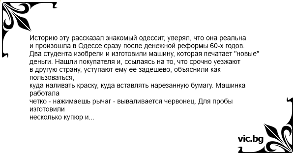 Историю эту рассказал знакомый одессит, уверял, что она реальна и произошла в Одессе сразу после денежной реформы 60-х годов.