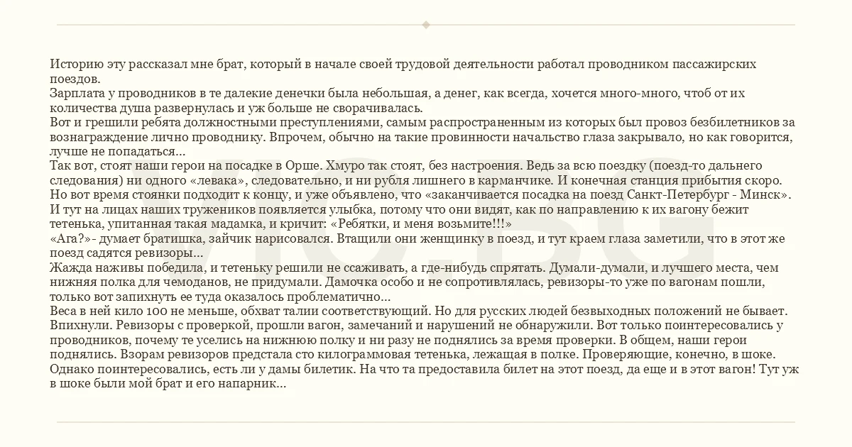 Историю эту рассказал мне брат, который в начале своей трудовой деятельности работал проводником пассажирских поездов. Зарплата у проводников в те далекие денечки была небольшая, а денег, как всегда, хочется много-много, чтоб от их количества душа развернулась и уж больше не сворачивалась. Вот и грешили ребята должностными преступлениями, самым распространенным из которых был провоз безбилетников за вознаграждение лично проводнику. Впрочем, обычно на такие провинности начальство глаза закрывало, но как говорится, лучше не попадаться… Так вот, стоят наши герои на посадке в Орше. Хмуро так стоят, без настроения. Ведь за всю поездку (поезд-то дальнего следования) ни одного «левака», следовательно, и ни рубля лишнего в карманчике. И конечная станция прибытия скоро. Но вот время стоянки подходит к концу, и уже объявлено, что «заканчивается посадка на поезд Санкт-Петербург - Минск». И тут на лицах наших тружеников появляется улыбка, потому что они видят, как по направлению к их вагону бежит тетенька, упитанная такая мадамка, и кричит: «Ребятки, и меня возьмите!!!» «Ага?»- думает братишка, зайчик нарисовался. Втащили они женщинку в поезд, и тут краем глаза заметили, что в этот же поезд садятся ревизоры… Жажда наживы победила, и тетеньку решили не ссаживать, а где-нибудь спрятать. Думали-думали, и лучшего места, чем нижняя полка для чемоданов, не придумали. Дамочка особо и не сопротивлялась, ревизоры-то уже по вагонам пошли, только вот запихнуть ее туда оказалось проблематично… Веса в ней кило 100 не меньше, обхват талии соответствующий. Но для русских людей безвыходных положений не бывает. Впихнули. Ревизоры с проверкой, прошли вагон, замечаний и нарушений не обнаружили. Вот только поинтересовались у проводников, почему те уселись на нижнюю полку и ни разу не поднялись за время проверки. В общем, наши герои поднялись. Взорам ревизоров предстала сто килограммовая тетенька, лежащая в полке. Проверяющие, конечно, в шоке. Однако поинтересовались, есть ли у дамы билетик. На что та предоставила билет на этот поезд, да еще и в этот вагон! Тут уж в шоке были мой брат и его напарник…