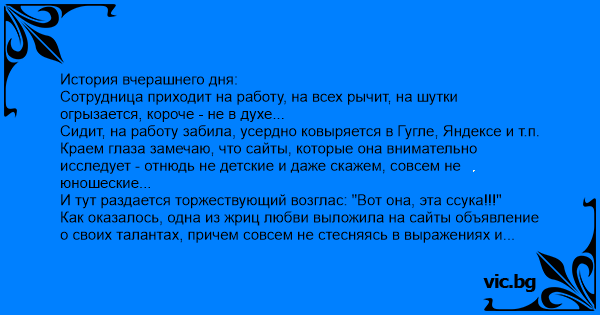 История вчерашнего дня: Сотрудница приходит на работу, на всех рычит, на шутки огрызается, короче - не в духе... Сидит, на работу забила, усердно ковыряется в Гугле, Яндексе и т.п. Краем глаза замечаю, что сайты, которые она внимательно исследует - отнюдь не детские и даже скажем, совсем не юношеские... И тут раздается торжествующий возглас: "Вот она, эта ссука!!!" Как оказалось, одна из жриц любви выложила на сайты объявление о своих талантах, причем совсем не стесняясь в выражениях и фотоснимках, подтверждающих ее высокую квалификацию. Ниже списка оказываемых услуг она расположила ссылку на страничку своего сайта и свои данные: "Параметры: 91-61-91" В итоге всего этого непотребства, пьяные в сиську мужики легко допускали, что в слове ТЕЛЕФОН неграмотная пpoctиtуtka допустила столько ошибок, что оно превратилось в ПАРАМЕТРЫ... и звонили, звонили, звонили... и даже сейчас звонят... И самое печальное, что и пожаловаться некуда - сайт профильный, обьявление в норме и соответствует стилю и духу аналогичных предложений. Телефон сейчас отключен, ибо даже днем поток входящих намекает на быстрое и легкое обогащение и вызывает взрывы хохота сотрудников. Номер менять человек не хочет, видимо придется идти на контакт со жрицей любви и просить, чтоб изменила дефисы на косые черточки, что ли, или заказывать взлом сайта :)