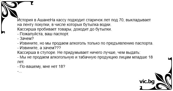 История в АшанеНа кассу подходит старичок лет под 70, выкладывает на ленту покупки, в числе которых бутылка водки.
