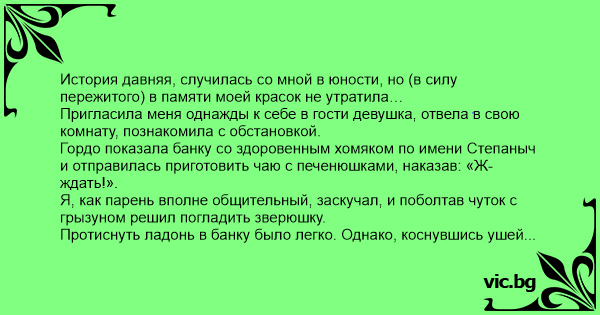 Гордо показала банку со здоровенным хомяком по имени Степаныч и отправилась приготовить чаю с печенюшками, наказав: «Ж-ждать!».