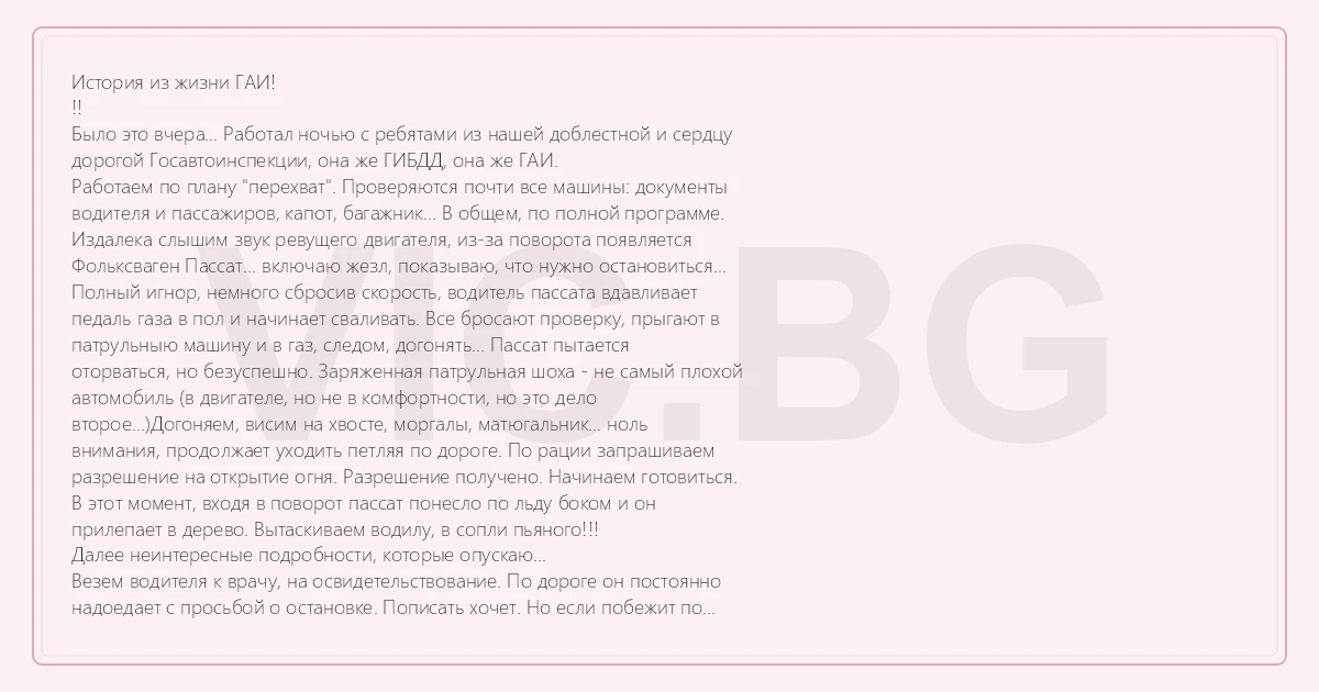 История из жизни ГАИ! !! Было это вчера... Работал ночью с ребятами из нашей доблестной и сердцу дорогой Госавтоинспекции, она же ГИБДД, она же ГАИ. Работаем по плану "перехват". Проверяются почти все машины: документы водителя и пассажиров, капот, багажник... В общем, по полной программе. Издалека слышим звук ревущего двигателя, из-за поворота появляется Фольксваген Пассат... включаю жезл, показываю, что нужно остановиться... Полный игнор, немного сбросив скорость, водитель пассата вдавливает педаль газа в пол и начинает сваливать. Все бросают проверку, прыгают в патрульныю машину и в газ, следом, догонять... Пассат пытается оторваться, но безуспешно. Заряженная патрульная шоха - не самый плохой автомобиль (в двигателе, но не в комфортности, но это дело второе...)Догоняем, висим на хвосте, моргалы, матюгальник... ноль внимания, продолжает уходить петляя по дороге. По рации запрашиваем разрешение на открытие огня. Разрешение получено. Начинаем готовиться. В этот момент, входя в поворот пассат понесло по льду боком и он прилепает в дерево. Вытаскиваем водилу, в сопли пьяного!!! Далее неинтересные подробности, которые опускаю... Везем водителя к врачу, на освидетельствование. По дороге он постоянно надоедает с просьбой о остановке. Пописать хочет. Но если побежит по полю, запаримся за ним бегать, отказываем и просим потерпеть, почти приехали. Заходим к врачу, кадр бегом в туалет. Перед нами еще 2 экипажа с разных районов города, с такими же готовыми кадрами. Возвращается из туалета наш, и между этими автоалкоголиками завязывается разговор... Слышал краем уха, поэтому передаю дословно: Наш: А говорят,что если мочу попить, то детектор не определит опьянение,я, только приехали сразу в сортир и попил... Второй: Нет, моча не помогает, надо... говна... поесть Третий, кивая пьной головой, молча подтверждает... сказать не может. Наш кадр, подрывается с воплями "Опять в сортир хочу". пустили. Первые двое уже зафиксировались и уехали, врачи зовут нашего, а он в туалете уже минут 10 сидит, не выходит и молчит. Захожу, а он сидит у унитаза и жрет свои фикалии. Руки в дерьме, морда в дерьме... Я тихо сползаю по стене... В результате, мужика выгнали на улицу так и не оформив... вонял слишком.. Я-то думал, что туфта все это... а оказалось действительно помогает. Мужик остался с правами, полным желудком, но с разбитой машиной и парой ссадин на лице за неподчинение требованию об остановке. Даже отказ не заставляли подписывать... руки-то в дерьме все, испачкает официальные бумаги. Так-что, любителям поездить пьяным за рулем - БЕРИТЕ НА ЗАМЕТКУ