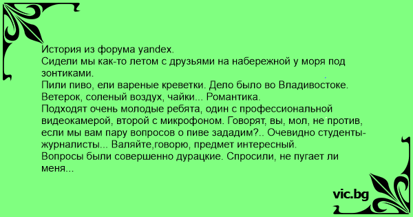 История из форума yandex. Сидели мы как-то летом с друзьями на набережной у моря под зонтиками. Пили пиво, ели вареные креветки. Дело было во Владивостоке. Ветерок, соленый воздух, чайки... Романтика. Подходят очень молодые ребята, один с профессиональной видеокамерой, второй с микрофоном. Говорят, вы, мол, не против, если мы вам пару вопросов о пиве зададим?.. Очевидно студенты-журналисты... Валяйте,говорю, предмет интересный. Вопросы были совершенно дурацкие. Спросили, не пугает ли меня перспектива большого живота и ранней импотенции. Не, говорю, не пугает. На том пареньки и удалились. Посидели мы еще с часок, потом стали расходиться. Иду я, не торопясь, вдоль набережной и вижу такую картину: по бережку очень быстро бегут студенты-журналисты, а за ними вприпрыжку в одних трусах загорающий мужик лет сорока пяти с красной рожей, ОГРОМНЫМ животом и с кружкой пива в руке: "Я ттте, ссука, дам, б&%#ь, раннюю импотенцию!!!"