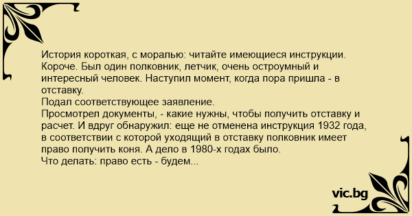 История короткая, с моралью: читайте имеющиеся инструкции. Короче. Был один полковник, летчик, очень остроумный и интересный человек. Наступил момент, когда пора пришла - в отставку. Подал соответствующее заявление. Просмотрел документы, - какие нужны, чтобы получить отставку и расчет. И вдруг обнаружил: еще не отменена инструкция 1932 года, в соответствии с которой уходящий в отставку полковник имеет право получить коня. А дело в 1980-х годах было. Что делать: право есть - будем требовать. И - потребовал. Проблема была - на весь военный округ. Коня-то взять негде... В общем, муторил он окружное начальство месяц. Наконец, согласился на денежную компенсацию... Так что - читайте инструкции.