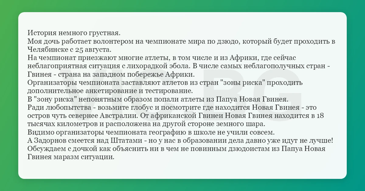 История немного грустная. Моя дочь работает волонтером на чемпионате мира по дзюдо, который будет проходить в Челябинске с 25 августа. На чемпионат приезжают многие атлеты, в том числе и из Африки, где сейчас неблагоприятная ситуация с лихорадкой эбола. В числе самых неблагополучных стран - Гвинея - страна на западном побережье Африки. Организаторы чемпионата заставляют атлетов из стран "зоны риска" проходить дополнительное анкетирование и тестирование. В "зону риска" непонятным образом попали атлеты из Папуа Новая Гвинея. Ради любопытства - возьмите глобус и посмотрите где находится Новая Гвинея - это остров чуть севернее Австралии. От африканской Гвинеи Новая Гвинея находится в 18 тысячах километров и расположена на другой стороне земного шара. Видимо организаторы чемпионата географию в школе не учили совсем. А Задорнов смеется над Штатами - но у нас в образовании дела давно уже идут не лучше! Обсуждаем с дочкой как объяснить ни в чем не повинным дзюдоистам из Папуа Новая Гвинея маразм ситуации.