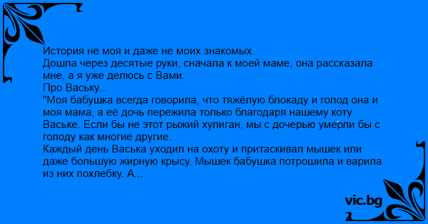 "Моя бабушка всегда говорила, что тяжёлую блокаду и голод она и моя мама, а её дочь пережила только благодаря нашему коту Ваське. Если бы не этот рыжий хулиган, мы с дочерью умерли бы с голоду как многие другие.