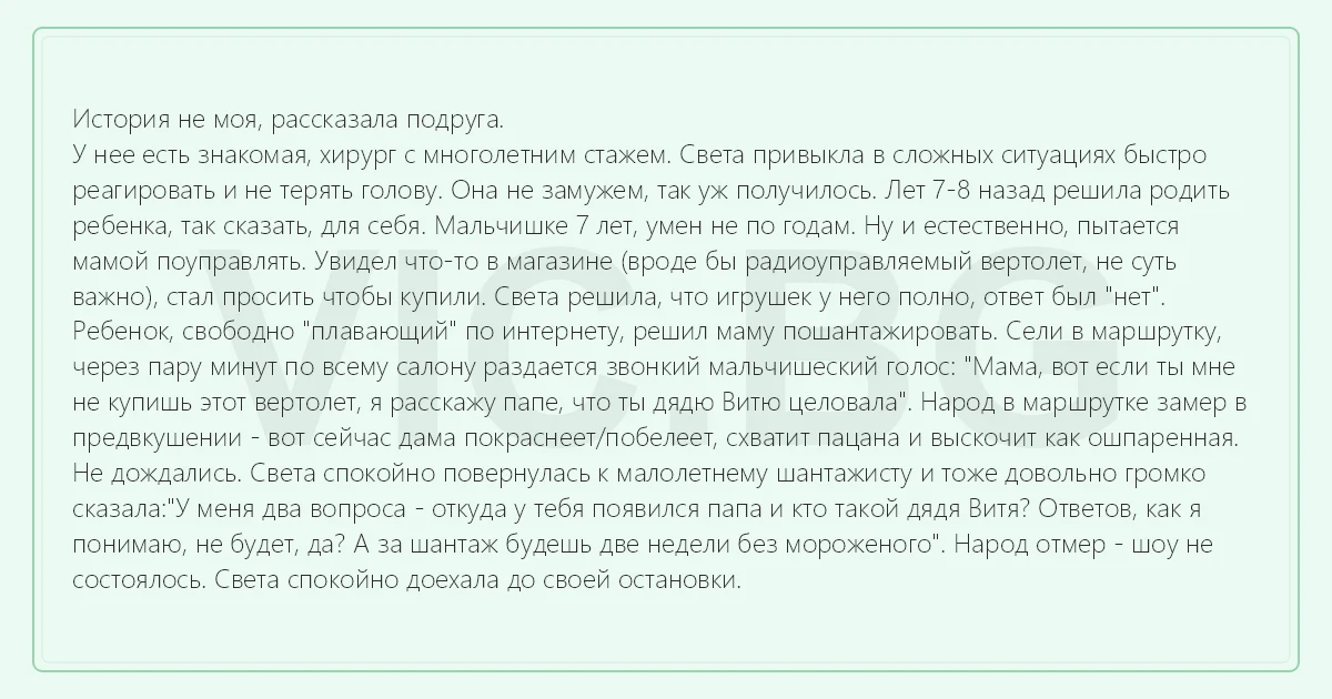 У нее есть знакомая, хирург с многолетним стажем. Света привыкла в сложных ситуациях быстро реагировать и не терять голову. Она не замужем, так уж получилось. Лет 7-8 назад решила родить ребенка, так сказать, для себя. Мальчишке 7 лет, умен не по годам. Ну и естественно, пытается мамой поуправлять. Увидел что-то в магазине (вроде бы радиоуправляемый вертолет, не суть важно), стал просить чтобы купили. Света решила, что игрушек у него полно, ответ был "нет". Ребенок, свободно "плавающий" по интернету, решил маму пошантажировать. Сели в маршрутку, через пару минут по всему салону раздается звонкий мальчишеский голос: "Мама, вот если ты мне не купишь этот вертолет, я расскажу папе, что ты дядю Витю целовала". Народ в маршрутке замер в предвкушении - вот сейчас дама покраснеет/побелеет, схватит пацана и выскочит как ошпаренная. Не дождались. Света спокойно повернулась к малолетнему шантажисту и тоже довольно громко сказала:"У меня два вопроса - откуда у тебя появился папа и кто такой дядя Витя? Ответов, как я понимаю, не будет, да? А за шантаж будешь две недели без мороженого". Народ отмер - шоу не состоялось. Света спокойно доехала до своей остановки.