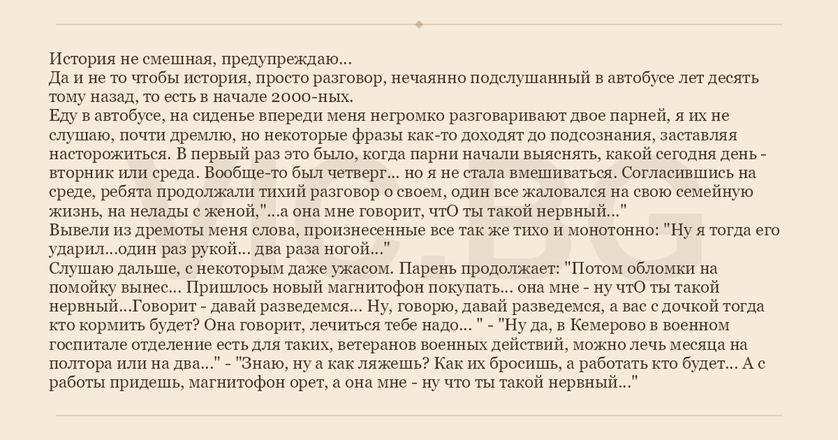 История не смешная, предупреждаю... Да и не то чтобы история, просто разговор, нечаянно подслушанный в автобусе лет десять тому назад, то есть в начале 2000-ных. Еду в автобусе, на сиденье впереди меня негромко разговаривают двое парней, я их не слушаю, почти дремлю, но некоторые фразы как-то доходят до подсознания, заставляя насторожиться. В первый раз это было, когда парни начали выяснять, какой сегодня день - вторник или среда. Вообще-то был четверг... но я не стала вмешиваться. Согласившись на среде, ребята продолжали тихий разговор о своем, один все жаловался на свою семейную жизнь, на нелады с женой,"...а она мне говорит, чтО ты такой нервный..." Вывели из дремоты меня слова, произнесенные все так же тихо и монотонно: "Ну я тогда его ударил...один раз рукой... два раза ногой..." Слушаю дальше, с некоторым даже ужасом. Парень продолжает: "Потом обломки на помойку вынес... Пришлось новый магнитофон покупать... она мне - ну чтО ты такой нервный...Говорит - давай разведемся... Ну, говорю, давай разведемся, а вас с дочкой тогда кто кормить будет? Она говорит, лечиться тебе надо... " - "Ну да, в Кемерово в военном госпитале отделение есть для таких, ветеранов военных действий, можно лечь месяца на полтора или на два..." - "Знаю, ну а как ляжешь? Как их бросишь, а работать кто будет... А с работы придешь, магнитофон орет, а она мне - ну что ты такой нервный..."