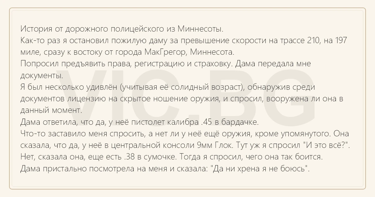 Что-то заставило меня спросить, а нет ли у неё ещё оружия, кроме упомянутого. Она сказала, что да, у неё в центральной консоли 9мм Глок. Тут уж я спросил "И это всё?". Нет, сказала она, еще есть .38 в сумочке. Тогда я спросил, чего она так боится.