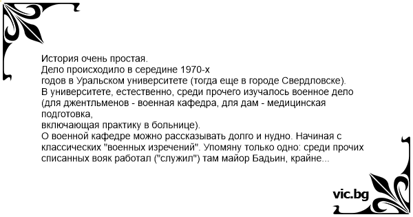 История очень простая. Дело происходило в середине 1970-х годов в Уральском университете (тогда еще в городе Свердловске). В университете, естественно, среди прочего изучалось военное дело (для джентльменов - военная кафедра, для дам - медицинская подготовка, включающая практику в больнице). О военной кафедре можно рассказывать долго и нудно. Начиная с классических "военных изречений". Упомяну только одно: среди прочих списанных вояк работал ("служил") там майор Бадьин, крайне гордившийся своим изобретением - он изобрел "командирский ящик КЯ-1" (такая коро- бочка со всякой ерундой, типа карандашей и курвиметров). Сей майор любил говаривать: "Хорошо, когда тебя студенты ругают: если тебя поносит враг, значит ты действуешь правильно". А среди дам, прошедших медицину, самым знаменитым моментом был случай во время практики в больнице (поверьте, не анекдот!) Юной студентке-историне было поручено собрать "общий анализ" мочи с двух палат в больнице. Она и собрала "общий": слила все взятое у всех больных в один сосуд вместе... Персонал был потрясен - им и в голову не приходило, что такое вообще возможно...