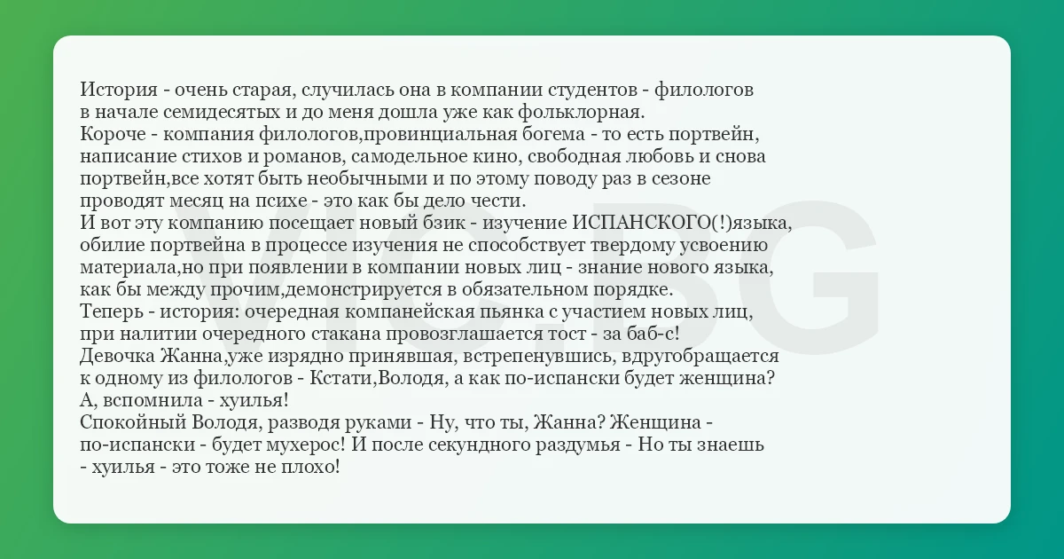 История - очень старая, случилась она в компании студентов - филологов в начале семидесятых и до меня дошла уже как фольклорная. Короче - компания филологов,провинциальная богема - то есть портвейн, написание стихов и романов, самодельное кино, свободная любовь и снова портвейн,все хотят быть необычными и по этому поводу раз в сезоне проводят месяц на психе - это как бы дело чести. И вот эту компанию посещает новый бзик - изучение ИСПАНСКОГО(!)языка, обилие портвейна в процессе изучения не способствует твердому усвоению материала,но при появлении в компании новых лиц - знание нового языка, как бы между прочим,демонстрируется в обязательном порядке. Теперь - история: очередная компанейская пьянка с участием новых лиц, при налитии очередного стакана провозглашается тост - за баб-с! Девочка Жанна,уже изрядно принявшая, встрепенувшись, вдругобращается к одному из филологов - Кстати,Володя, а как по-испански будет женщина? А, вспомнила - хуилья! Спокойный Володя, разводя руками - Ну, что ты, Жанна? Женщина - по-испански - будет мухерос! И после секундного раздумья - Но ты знаешь - хуилья - это тоже не плохо!