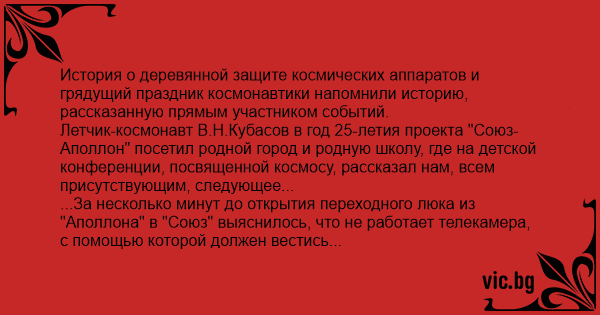 История о деревянной защите космических аппаратов и грядущий праздник космонавтики напомнили историю, рассказанную прямым участником событий. Летчик-космонавт В.Н.Кубасов в год 25-летия проекта "Союз-Аполлон" посетил родной город и родную школу, где на детской конференции, посвященной космосу, рассказал нам, всем присутствующим, следующее... ...За несколько минут до открытия переходного люка из "Аполлона" в "Союз" выяснилось, что не работает телекамера, с помощью которой должен вестись эпохальный репортаж о стыковке. Возможная причина - разъем в коммутационном блоке, находящимся под пультом космонавта в ногах. Развинтить десятки винтов, для этого не предназначенных - невозможно. И тогда Кубасов (бортинженер) принимает решение вскрыть крышку обычным консервным ножом, что ему успешно удалось. За минуты повреждение было устранено, а для изоляции использовался обычный лейкопластырь. Но соль не в этом. Когда в корабль вошли американцы, Стаффорд уселся как раз в то кресло, под которым был вырезан люк. Протянул ноги.. и остался доволен - ноги никуда не упирались. Рослый американец (190 см) отметил удобство советского корабля и тесноту американского. Наши космонавты кивали головами, мечтая только о том, чтоб американец своими ногами не повредил скрученные пластырем провода... Впрочем, пластырь оказался очень хорошим. Как всё, что делали для космоса.