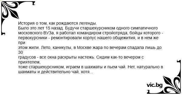 История о том, как рождаются легенды. Было это лет 15 назад. Будучи старшекурсником одного симпатичного московского ВУЗа, я работал командиром стройотряда, бойцы которого - первокурсники - ремонтировали корпус нашего общежития, и в нем же при этом жили. Лето, каникулы, в Москве жара по вечерам спадала лишь до 30 градусов - все окна раскрыты настежь. Сидим как-то вечером с приятелем, тоже старшекурсником, играем в шахматы и пьем чай. Нет, натурально в шахматы и действительно чай, хотя преферанс и пиво были существенно популярней. Так вот, мирно так сидим, на пятом этаже общаги, а в комнате над нами, на шестом, самом верхнем этаже, "гуляли" первокурсники из моего стройотряда - они как раз пили пиво, и, видимо, приняли немало, так как шум у нас над головой стоял невыносимый. В какой-то момент стало совсем невмоготу - ребятки наверху принялись гарцевать по комнате на стульях. Я уже грешным делом подумывал, не подняться ли мне и не попросить ли их поутихнуть. Тут мой приятель изобретает нестандартный ход. Он берет огромную консервную банку, полную бычков (мы использовали ее как пепельницу), забирается на подоконник и ловким баскетболистским движение забрасывает банку в открытое окно комнаты наверху. Шум там мгновенно стихает и, что удивительно, не возобновляется. Мы спокойно доигрываем нашу шахматную партию. Так вот. Прихожу я утром на работу - а начиналась она с разводки студентов по объектам, для чего все собирались вместе, - и слышу разговор двух первокурсников: - Вчера чо было - не поверишь! Прикинь, квасили мы, ну приняли пивка неслабо, и тут курево у нас кончилось - не запаслись. Совсем уже охренели без курева, сели на стулья, начали скакать на них по комнате и молить Господа, чтобы хоть бычков нам подкинул. И тут - прикинь, ты не поверишь - в открытое окно влетает охеренная банка с бычками! Это на шестом этаже! Пять человек свидетелей! И что мы блок Мальборо не попросили!???