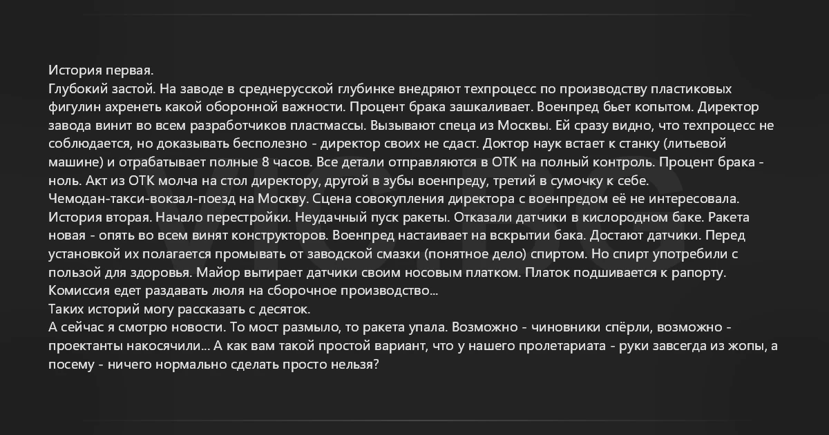 История первая. Глубокий застой. На заводе в среднерусской глубинке внедряют техпроцесс по производству пластиковых фигулин ахренеть какой оборонной важности. Процент брака зашкаливает. Военпред бьет копытом. Директор завода винит во всем разработчиков пластмассы. Вызывают спеца из Москвы. Ей сразу видно, что техпроцесс не соблюдается, но доказывать бесполезно - директор своих не сдаст. Доктор наук встает к станку (литьевой машине) и отрабатывает полные 8 часов. Все детали отправляются в ОТК на полный контроль. Процент брака - ноль. Акт из ОТК молча на стол директору, другой в зубы военпреду, третий в сумочку к себе. Чемодан-такси-вокзал-поезд на Москву. Сцена совокупления директора с военпредом её не интересовала. История вторая. Начало перестройки. Неудачный пуск ракеты. Отказали датчики в кислородном баке. Ракета новая - опять во всем винят конструкторов. Военпред настаивает на вскрытии бака. Достают датчики. Перед установкой их полагается промывать от заводской смазки (понятное дело) спиртом. Но спирт употребили с пользой для здоровья. Майор вытирает датчики своим носовым платком. Платок подшивается к рапорту. Комиссия едет раздавать люля на сборочное производство... Таких историй могу рассказать с десяток. А сейчас я смотрю новости. То мост размыло, то ракета упала. Возможно - чиновники спёрли, возможно - проектанты накосячили... А как вам такой простой вариант, что у нашего пролетариата - руки завсегда из жопы, а посему - ничего нормально сделать просто нельзя?