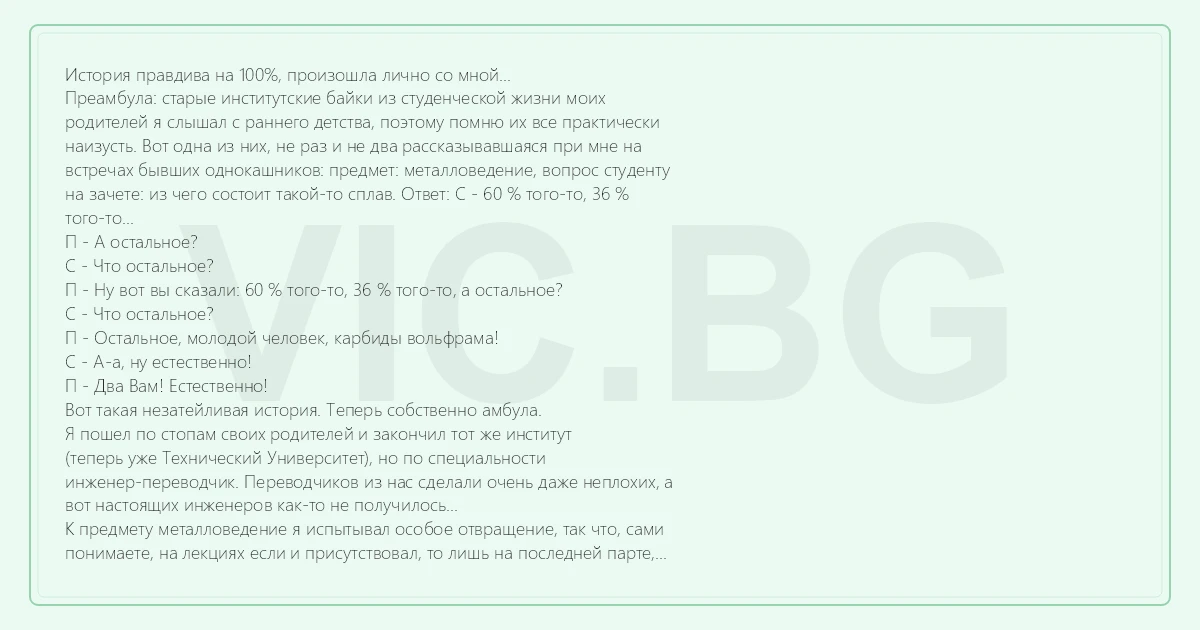 История правдива на 100%, произошла лично со мной... Преамбула: старые институтские байки из студенческой жизни моих родителей я слышал с раннего детства, поэтому помню их все практически наизусть. Вот одна из них, не раз и не два рассказывавшаяся при мне на встречах бывших однокашников: предмет: металловедение, вопрос студенту на зачете: из чего состоит такой-то сплав. Ответ: С - 60 % того-то, 36 % того-то... П - А остальное? С - Что остальное? П - Ну вот вы сказали: 60 % того-то, 36 % того-то, а остальное? С - Что остальное? П - Остальное, молодой человек, карбиды вольфрама! С - А-а, ну естественно! П - Два Вам! Естественно! Вот такая незатейливая история. Теперь собственно амбула. Я пошел по стопам своих родителей и закончил тот же институт (теперь уже Технический Университет), но по специальности инженер-переводчик. Переводчиков из нас сделали очень даже неплохих, а вот настоящих инженеров как-то не получилось... К предмету металловедение я испытывал особое отвращение, так что, сами понимаете, на лекциях если и присутствовал, то лишь на последней парте, занимаясь исключительно собственными делами. На одной из таких лекций мы с моми другом, как обычно, сидели на заднем ряду и увлеченно играли кажется в «го». В какой-то момент, не отрываясь от игры я слышу настойчивый вопрос препдавателя: «А остальное?», повторяющийся несколько раз... Совершенно на автомате и, как потом выяснилось, уже в абсолютной тишине я негромко выдаю своему товарищу: «Остальное карбиды вольфрама!». И слышу реплику преподавателя: «Кто это сказал?». Пришлось подняться... В общем остальным действительно оказались карбиды вольфрама и зачет по металловедению я получил тут же автоматом... Я был потрясен, но еще больше была потрясена девушка, отличница, первая учиница, которая, оказывается все это время стояла у доски и не могла ответить на знакомый мне с пеленок вопрос. Вот собственно и все. Привет группе 15!