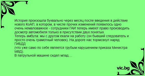 История произошла буквально через месяц после введения в действие нового КоАП, в котором, в числе прочих изменений появилось одно очень немаловажное - сотрудники ГАИ теперь имеют право производить досмотр автомобиля только в присутствии двух понятых. Теперь амбула: мы с другом ехали на работу (он бывший следователь и просто очень грамотный человек). На дороге нас тормознул наряд ГИБДД (что уже само по себе является грубым нарушением приказа Министра МВД). В патрульной машине сидел млад. лейтенант, в сопровождении двух сержантов, которые попросили открыть багажник на предмет досмотра. Мой товарищ честно и откровенно, уподобившись Якубовичу, сказал, что откороет черный ящик (багажник) только в присутствии двух понятых. Гаишники удивились, помялись, и остановили авто, из которого извлекли двух граждан, предложив им быть понятыми. Мало того, мой друг продиктовал гаишникам полный текст протокола досмотра, поскольку они имели весьма смутное представление о таковом, завершив инструктаж словами: ".. в результате досмотра обнаружено...", открыл багажник "девятки", в котором была только запаска: ".... ничего не обнаружено". Нужно было видеть выражения лиц стражей правопорядка на дорогах - они после такой авансцены ожидали увидеть там по меньшей мере пулемет и кило наркоты! После чего мой друг, расцепив 3 экземпляра протокола, раздал их гаишникам с такими словами: "Этот экземпляр мне, этот - прокурору, а этот - вам - пропуск в свободную жизнь!" Теперь, на всем протяжении федеральной трассы его никто не тормозит, даже на стационарных постах! Граждане автомобилисты, изучайте КоАП! (с)Bazder