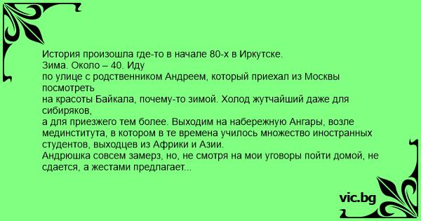 История произошла где-то в начале 80-х в Иркутске. Зима. Около – 40. Иду по улице с родственником Андреем, который приехал из Москвы посмотреть на красоты Байкала, почему-то зимой. Холод жутчайший даже для сибиряков, а для приезжего тем более. Выходим на набережную Ангары, возле мединститута, в котором в те времена училось множество иностранных студентов, выходцев из Африки и Азии. Андрюшка совсем замерз, но, не смотря на мои уговоры пойти домой, не сдается, а жестами предлагает гулять дальше. Немногочисленные прохожие укутаны в меха, из которых торчат красно-фиолетовые щеки и носы. Говорю, что в такую погоду замерзнуть можно, да так и остаться на берегу Ангары до весны, только с оттепелью и найдут посиневший от холода труп. По глазам Андрея вижу, что верит, и мы поворачиваем домой. Перед нами, поеживаясь от холода, семенит парень в легкой куртке с капюшоном на голове. На что мой родственничек, с трудом шевеля замерзшими губами, замечает, что, дескать, приезжий, раз так легко одет. Соглашаюсь, и собираюсь рассказать Андрею, что это должно быть студент из теплой страны, приехавший учиться уму разуму в суровой Сибири. А одет легко, потому что общежитие рядом. Но тут парень подскальзывается и падает плашмя на спину. Андрей, опережая меня, спешит ему на помощь. Склоняется над незадачливым прохожим, лицо его резко перекашивается и из уст вырывается не то стон, не то вопль, объятого ужасом человека. Я подскакиваю и вижу перед собой напуганного чернокожего юношу. Ну, чернокожего это легко сказано. Цвета он такого, что и передать трудно, такой темно-фиолетовый с синим отливом от холода. Мне таких замерзших ребят уже приходилось не раз видеть. Протягиваю ему руку, но он на спине отползает от меня и моего, застывшего с выпученными глазами, родственника, вскакивает на ноги и быстро удаляется в сторону мединститута. Вижу, что парень обронил ручку, и говорю Андрею (ну что в самом деле, столичный житель негров никогда не видел что ли?) чтобы он исправил ситуацию: догнал парня и отдал ему ручку. В общем, поворачиваюсь к моему москвичу, а он медленно так оседает на снег. Пришлось ловить тачку, и в скором порядке везти горе-путешественника домой, откачивать и отпаивать. Он потом признался, что под впечатлением моего рассказа о посиневшем трупе, подумал, что человек замерз прямо на ходу, и кожа у него почернела. А когда парень ему руку стал подавать, то тут уж Андрюхе совсем сплохело – эдакий живой труп! Больше он в Иркутск зимой не приезжал. А ручку забрал на память о сибирских морозах и отважных медиках с африканского континента.