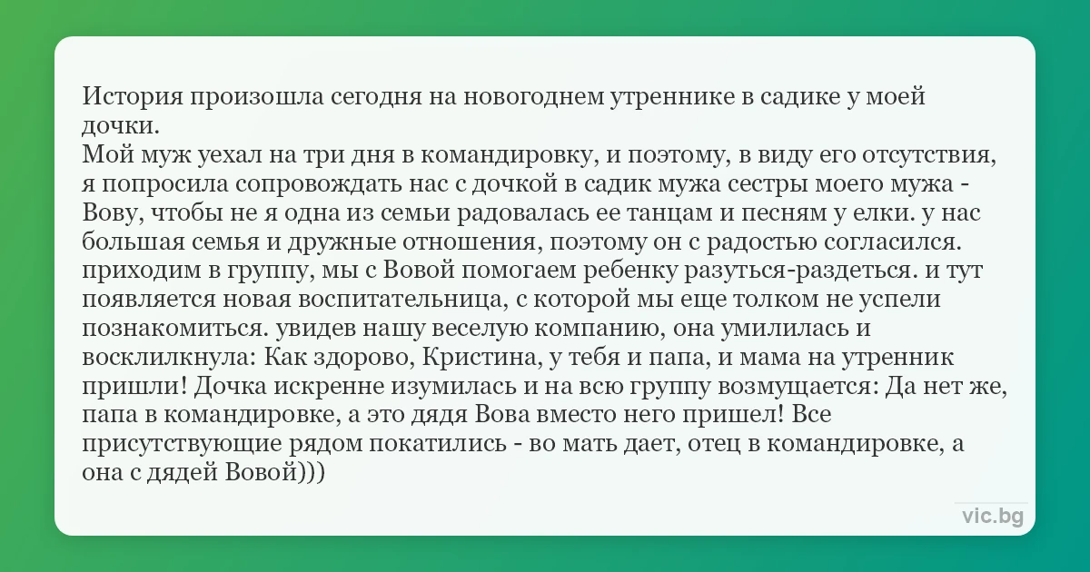 История произошла сегодня на новогоднем утреннике в садике у моей дочки. Мой муж уехал на три дня в командировку, и поэтому, в виду его отсутствия, я попросила сопровождать нас с дочкой в садик мужа сестры моего мужа - Вову, чтобы не я одна из семьи радовалась ее танцам и песням у елки. у нас большая семья и дружные отношения, поэтому он с радостью согласился. приходим в группу, мы с Вовой помогаем ребенку разуться-раздеться. и тут появляется новая воспитательница, с которой мы еще толком не успели познакомиться. увидев нашу веселую компанию, она умилилась и восклилкнула: Как здорово, Кристина, у тебя и папа, и мама на утренник пришли! Дочка искренне изумилась и на всю группу возмущается: Да нет же, папа в командировке, а это дядя Вова вместо него пришел! Все присутствующие рядом покатились - во мать дает, отец в командировке, а она с дядей Вовой)))