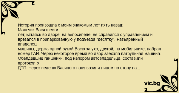История произошла с моим знакомым лет пять назад: Мальчик Вася шести лет, катаясь во дворе, на велосипеде, не справился с управлением и врезался в припаркованную у подъезда "десятку". Разъяренный владелец машины, держа одной рукой Васю за ухо, другой, на мобильнике, набрал номер ГАИ. Через некоторое время во двор заехала патрульная машина. Обалдевшие гаишники, под напором автовладельца, составили протокол о ДТП. Через неделю Васиного папу возили лицом по столу на административной комиссии (Вася несовершеннолетний, поэтому протокол составили на папу). Гаишники и так не великие писатели, а в непривычной обстановке не сориентировались и понаписали в протоколе черт знает что. Члены комиссии долго выясняли, как Васин папа на детском велосипеде "Мишутка" сумел таранить "Жигули". В конце концов, разобрались, оштрафовав папу, на всякий случай, на 500 рублей, хорошо, прав не лишили. Дома папу ждал сюрприз в виде соседа автовладельца с калькуляцией ремонта машины. Согласно документу, машине были причинены повреждения, сопоставимые с попаданием в полноценное ДТП с "КамАЗом", как минимум. Папа отказался платить. Сосед подал заявление в райотдел, и в квартиру зачастил участковый. Маразм крепчал! Васю поставили на учет в Инспекцию по делам несовершеннолетних и вместе с папой вызвали на комиссию по делам этих самых несовершеннолетних при Администрации, где папу опять возили по столу, и на всякий случай еще раз оштрафовали на 300 рублей, за ненадлежащее воспитание сына. Дома их ждала повестка из суда, куда обратился обиженный сосед. Бедный папа, во избежание ухудшения ситуации (хотя куда уж хуже), категорически запретил Васе не только кататься на велосипеде, но и вообще гулять... По крайней мере, до того, как все утрясется. Теперь представьте картинку, которую наблюдали жильцы дома теплым воскресным днем: Мальчик Вася на лоджии грызет яблоко, с тоской наблюдая за резвящимися на улице сверстниками. - Вася, выходи гулять! - Не могу, дело еще не закрыли!