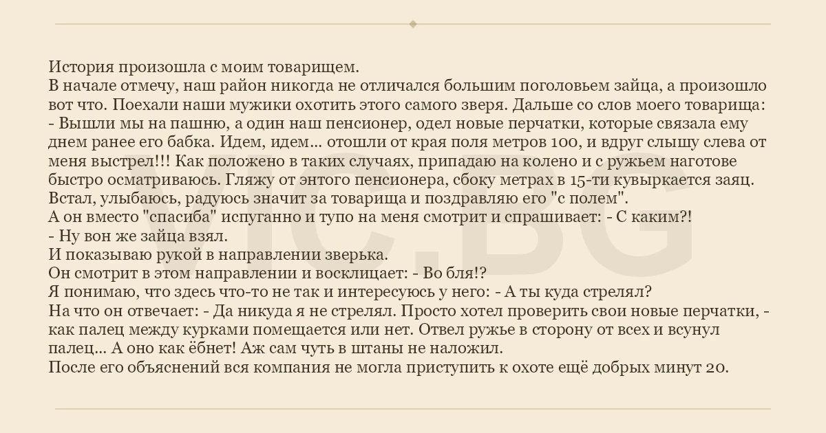 - Вышли мы на пашню, а один наш пенсионер, одел новые перчатки, которые связала ему днем ранее его бабка. Идем, идем... отошли от края поля метров 100, и вдруг слышу слева от меня выстрел!!! Как положено в таких случаях, припадаю на колено и с ружьем наготове быстро осматриваюсь. Гляжу от энтого пенсионера, сбоку метрах в 15-ти кувыркается заяц. Встал, улыбаюсь, радуюсь значит за товарища и поздравляю его "с полем".