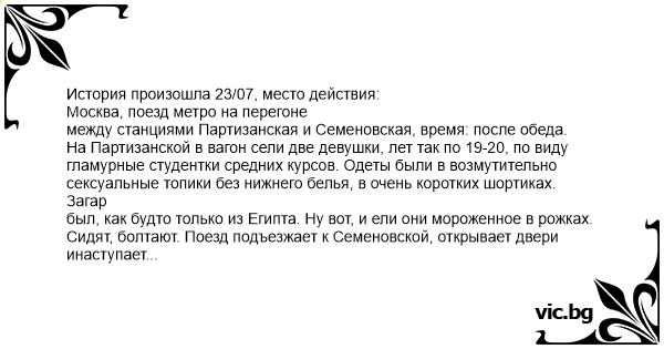 История произошла 23/07, место действия: Москва, поезд метро на перегоне между станциями Партизанская и Семеновская, время: после обеда. На Партизанской в вагон сели две девушки, лет так по 19-20, по виду гламурные студентки средних курсов. Одеты были в возмутительно сексуальные топики без нижнего белья, в очень коротких шортиках. Загар был, как будто только из Египта. Ну вот, и ели они мороженное в рожках. Сидят, болтают. Поезд подъезжает к Семеновской, открывает двери инаступает тишина. Кто пользуется метро знает такую тищину... В это время одна другой так с легкостью говорит (говорит как бы ей лично, но из-за тишины слышыт весь салон. - Мороженное не вкусное какое-то - (Вторая) Да, СПЕРМОВАТЫЙ вкус такой! - ------------------------------ Я увидел, что такое, когда на анекдот.ру пишут, что лежал весь салон! Пол Вагона метро просто согнулось от смеха. Девушки вышли на следующей, как ни в чем не бывало. Олег skywalker@rambler.ru