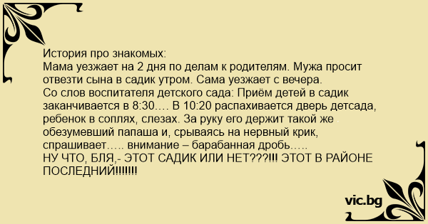 Со слов воспитателя детского сада: Приём детей в садик заканчивается в 8:30…. В 10:20 распахивается дверь детсада, ребенок в соплях, слезах. За руку его держит такой же обезумевший папаша и, срываясь на нервный крик, спрашивает….. внимание – барабанная дробь…..