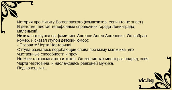 Никита наткнулся на фамилию: Ангелов Ангел Ангелович. Он набрал номер, и сказал (тупой детский юмор):