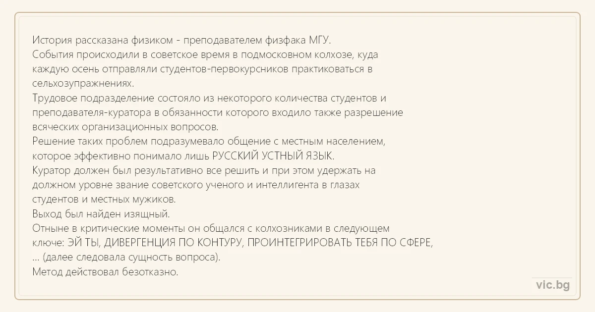 История рассказана физиком - преподавателем физфака МГУ. События происходили в советское время в подмосковном колхозе, куда каждую осень отправляли студентов-первокурсников практиковаться в сельхозупражнениях. Трудовое подразделение состояло из некоторого количества студентов и преподавателя-куратора в обязанности которого входило также разрешение всяческих организационных вопросов. Решение таких проблем подразумевало общение с местным населением, которое эффективно понимало лишь РУССКИЙ УСТНЫЙ ЯЗЫК. Куратор должен был результативно все решить и при этом удержать на должном уровне звание советского ученого и интеллигента в глазах студентов и местных мужиков. Выход был найден изящный. Отныне в критические моменты он общался с колхозниками в следующем ключе: ЭЙ ТЫ, ДИВЕРГЕНЦИЯ ПО КОНТУРУ, ПРОИНТЕГРИРОВАТЬ ТЕБЯ ПО СФЕРЕ, ... (далее следовала сущность вопроса). Метод действовал безотказно.