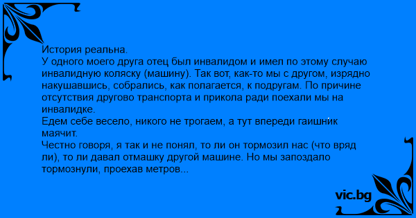 У одного моего друга отец был инвалидом и имел по этому случаю инвалидную коляску (машину). Так вот, как-то мы с другом, изрядно накушавшись, собрались, как полагается, к подругам. По причине отсутствия другово транспорта и прикола ради поехали мы на инвалидке.