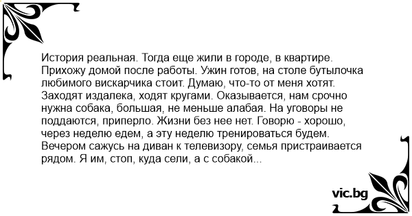 Прихожу домой после работы. Ужин готов, на столе бутылочка любимого вискарчика стоит. Думаю, что-то от меня хотят. Заходят издалека, ходят кругами. Оказывается, нам срочно нужна собака, большая, не меньше алабая. На уговоры не поддаются, приперло. Жизни без нее нет. Говорю - хорошо, через неделю едем, а эту неделю тренироваться будем.