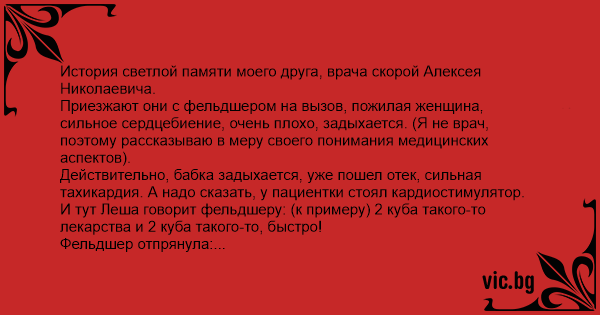 Приезжают они с фельдшером на вызов, пожилая женщина, сильное сердцебиение, очень плохо, задыхается. (Я не врач, поэтому рассказываю в меру своего понимания медицинских аспектов).