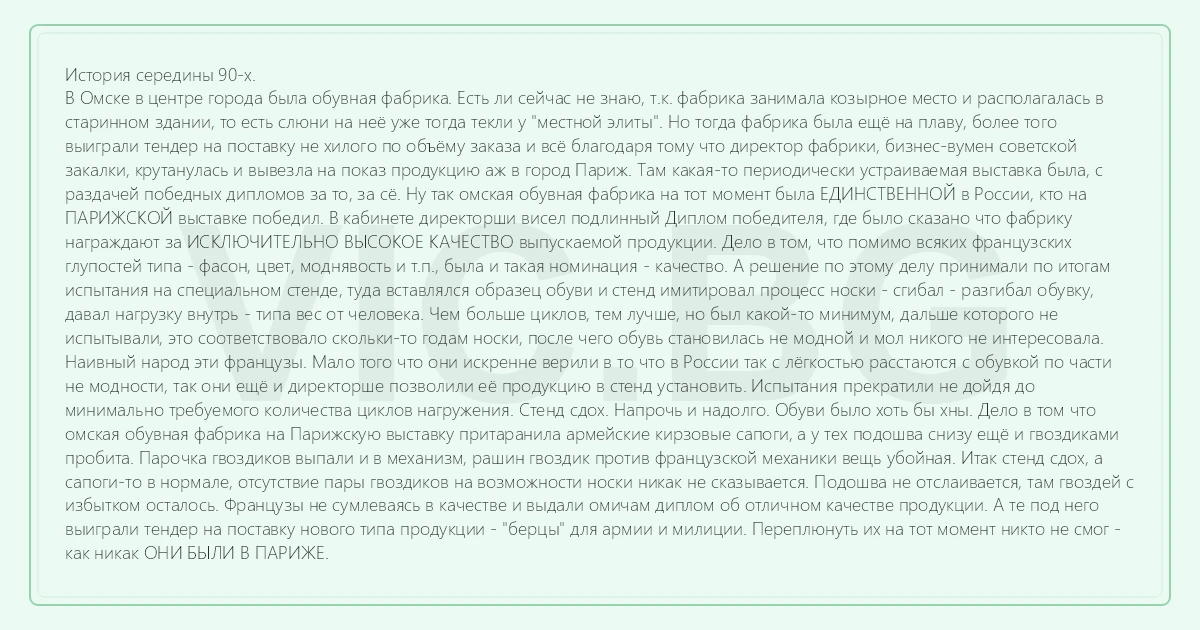 Наивный народ эти французы. Мало того что они искренне верили в то что в России так с лёгкостью расстаются с обувкой по части не модности, так они ещё и директорше позволили её продукцию в стенд установить. Испытания прекратили не дойдя до минимально требуемого количества циклов нагружения. Стенд сдох. Напрочь и надолго. Обуви было хоть бы хны. Дело в том что омская обувная фабрика на Парижскую выставку притаранила армейские кирзовые сапоги, а у тех подошва снизу ещё и гвоздиками пробита. Парочка гвоздиков выпали и в механизм, рашин гвоздик против французской механики вещь убойная. Итак стенд сдох, а сапоги-то в нормале, отсутствие пары гвоздиков на возможности носки никак не сказывается. Подошва не отслаивается, там гвоздей с избытком осталось. Французы не сумлеваясь в качестве и выдали омичам диплом об отличном качестве продукции. А те под него выиграли тендер на поставку нового типа продукции - "берцы" для армии и милиции. Переплюнуть их на тот момент никто не смог - как никак ОНИ БЫЛИ В ПАРИЖЕ.
