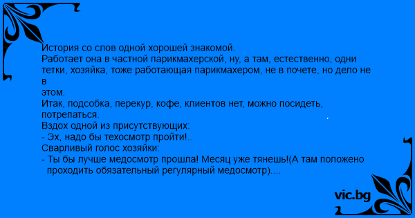- Ты бы лучше медосмотр прошла! Месяц уже тянешь!(А там положено