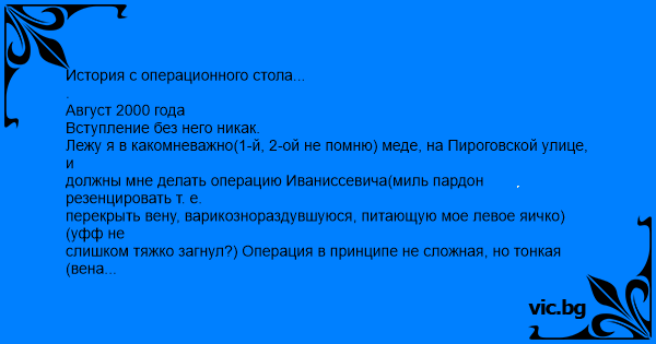 История с операционного стола... . Август 2000 года Вступление без него никак. Лежу я в какомневажно(1-й, 2-ой не помню) меде, на Пироговской улице, и должны мне делать операцию Иваниссевича(миль пардон резенцировать т. е. перекрыть вену, варикознораздувшуюся, питающую мое левое яичко) (уфф не слишком тяжко загнул?) Операция в принципе не сложная, но тонкая(вена проходит вплотную с семенным канатиком, для тех кто не понял - 0.5 мм в сторону и шансы заиметь ребенка падают уже не на 50% а на 75%.) Операцию должен проводить интерн(типа практикант) из Сирии - Абдусалам. Пару слов о нем. Настолько же волосатый, насколько и обаятельный парнище ему приходилось брить не только бороду и усы, но также и верх груди, спину и запястья, чтобы волосы не нарушали стерильность операции. Под руководством отличного дядьки нач. отделения по фамилии Чабан. Операционная этого меда - огромный зал на три операционных стола с застекленной галереей на втором этаже для студентов я так понимаю. Но слава богу на моей операции там никого не было. Дак вот лежу под местным наркозом, Чабан заклинает меня не шевелится, не смотреть и не спать(!?), и по его тону я понимаю, что это в моих интересах и веду себя паинькой. И тут блин основная часть, экшн, прости Господи.... Слева, на соседнем операционном столе, делают фемоз (у парня нераскрываемоть головки, ему удаляют крайнюю плоть) и их пациент нет не орет, визжит плохим фальцетом на протяжении всего этого действа и эхо его крика гуляет по операционной перемежаемое деловыми репликами врачей. Мне становится слегка не по себе потому что мои тоже напряглись с Абдусалама валит пот, он просто ВЕСЬ мокрый, с трудом пыхтит через мокрую ватно-марлевую повязку (может я у него экзамен, или что-то в этом роде). Чабан нахмурился но держит ситуацию под контролем. Тут после очередной порции визгов(парень как потом оказалоь сорвал голос) Чабан, который к слову сказать слегка заикался, вопрошает своего интерна: "Ну ч-что ты к-копаешся? Н-наркоз н-не р-резиновый!" Первая реакция была тупо заржать, но ее Чабан остановил оччень выразительным движением бровей, Вторая - испугаться и впасть в панику, но я не успел. Операция кончилась. Это были мои самые длинные 14 с половиной минут в жизни.