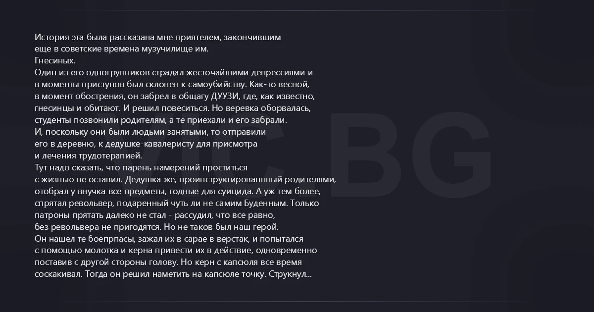 История эта была рассказана мне приятелем, закончившим еще в советские времена музучилище им. Гнесиных. Один из его одногрупников страдал жесточайшими депрессиями и в моменты приступов был склонен к самоубийству. Как-то весной, в момент обострения, он забрел в общагу ДУУЗИ, где, как известно, гнесинцы и обитают. И решил повеситься. Но веревка оборвалась, студенты позвонили родителям, а те приехали и его забрали. И, поскольку они были людьми занятыми, то отправили его в деревню, к дедушке-кавалеристу для присмотра и лечения трудотерапией. Тут надо сказать, что парень намерений проститься с жизнью не оставил. Дедушка же, проинструктированнный родителями, отобрал у внучка все предметы, годные для суицида. А уж тем более, спрятал револьвер, подаренный чуть ли не самим Буденным. Только патроны прятать далеко не стал - рассудил, что все равно, без револьвера не пригодятся. Но не таков был наш герой. Он нашел те боепрпасы, зажал их в сарае в верстак, и попытался с помощью молотка и керна привести их в действие, одновременно поставив с другой стороны голову. Но керн с капсюля все время соскакивал. Тогда он решил наметить на капсюле точку. Струкнул по нему легонько молотком и патрон, естесственно, выстрелил. Тут же из дома выскочил дедушка-кавалерист и обнаружив мальчика живым-здоровым, надрал ему задницу по полной программе. Эта процедура вылечила несчастного и больше он к проблеме суицида не возвращался.