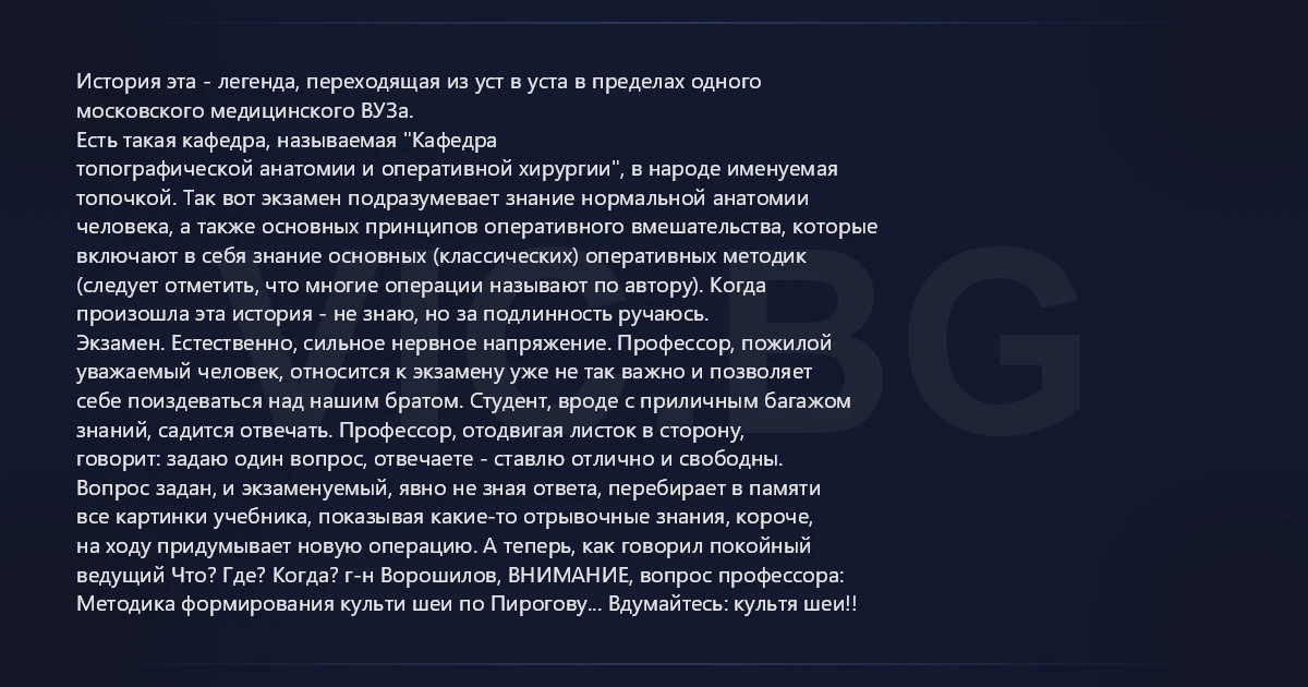 История эта - легенда, переходящая из уст в уста в пределах одного московского медицинского ВУЗа. Есть такая кафедра, называемая "Кафедра топографической анатомии и оперативной хирургии", в народе именуемая топочкой. Так вот экзамен подразумевает знание нормальной анатомии человека, а также основных принципов оперативного вмешательства, которые включают в себя знание основных (классических) оперативных методик (следует отметить, что многие операции называют по автору). Когда произошла эта история - не знаю, но за подлинность ручаюсь. Экзамен. Естественно, сильное нервное напряжение. Профессор, пожилой уважаемый человек, относится к экзамену уже не так важно и позволяет себе поиздеваться над нашим братом. Студент, вроде с приличным багажом знаний, садится отвечать. Профессор, отодвигая листок в сторону, говорит: задаю один вопрос, отвечаете - ставлю отлично и свободны. Вопрос задан, и экзаменуемый, явно не зная ответа, перебирает в памяти все картинки учебника, показывая какие-то отрывочные знания, короче, на ходу придумывает новую операцию. А теперь, как говорил покойный ведущий Что? Где? Когда? г-н Ворошилов, ВНИМАНИЕ, вопрос профессора: Методика формирования культи шеи по Пирогову... Вдумайтесь: культя шеи!!