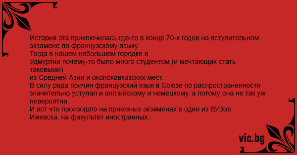 История эта приключилась где-то в конце 70-х годов на вступительном экзамене по французскому языку.