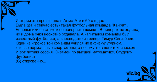 История эта произошла в Алма-Ате в 60-х годах. Была (да и сейчас есть) такая футбольная команда "Кайрат". Болельщики со стажем ее наверняка помнят. В лидерах не ходила, но и дома очки неохотно отдавала. А капитаном команды был известный футболист, а впоследствии тренер, Тимур Сегизбаев. Один из игроков той команды учился не в физкультурном, как все нормальные спортсмены, а почему-то в политехническом. И вот летняя сессия. Экзамен по высшей математике. Студент-футболист (С) откровенно плавает. Преподаватель (П) после тщетных попыток вытянуть хоть какие-нибудь знания на тройку в конце-концов предлагает прийти на пересдачу через недельку. С:- Я не могу через неделю. П:- А в чем дело? С:- Через неделю у нас игры на выезде. П:- Где? С:- В Москве... Преподаватель оказался болельщиком "Кайрата" и предложил футболисту сделку: "Сколько очков с выезда привезете, столько баллов за экзамен получишь". С:- Да вы что, из Москвы очко за счастье будет! П:- Тогда придете на пересдачу осенью. Смех смехом, но "Кайрат" в том выезде в Москве набрал в двух играх 3 (ТРИ!) очка, победив при этом "Спартак"! В "Советском спорте" после такого фурора алмаaтинских футболеров была опубликована статья "Тимур и его команда" (помните как звали кайратовского капитана?). И преподаватель свое слово сдержал. Именно от него я услышал эту историю, когда 20 лет спустя сам был его студентом.