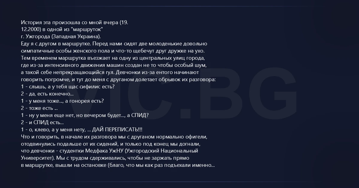История эта произошла со мной вчера (19. 12.2000) в одной из "маршруток" г. Ужгорода (Западная Украина). Еду я с другом в маршрутке. Перед нами сидят две молоденькие довольно симпатичные особы женского пола и что-то щебечут друг дружке на ухо. Тем временем маршрутка въезжает на одну из центральных улиц города, где из-за интенсивного движения машин создан не то чтобы особый шум, а такой себе непрекращающийся гул. Девчонки из-за ентого начинают говорить погромче, и тут до меня с друганом долетает обрывок их разговора: 1 - слышь, а у тебя щас сифилис есть? 2 - да, есть конечно... 1 - у меня тоже..., а гонорея есть? 2 - тоже есть ... 1 - ну у меня еще нет, но вечером будет..., а СПИД? 2 - и СПИД есть... 1 - о, клево, а у меня нету, ... ДАЙ ПЕРЕПИСАТЬ!!! Что и говорить, в начале их разговора мы с друганом нормально офигели, отодвинулись подальше от их сидений, и только под конец мы догнали, что девчонки - студентки Медфака УжНУ (Ужгородский Национальный Университет). Мы с трудом сдерживались, чтобы не заржать прямо в маршрутке, вышли на остановке (благо, что мы как раз подъехали именно к нашей), выскочили из маршрутки и начали дико ржать (правда, люди смотрели на нас как на двух конкретно съехавших идиотов).