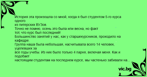 История эта произошла со мной, когда я был студентом 5-го курса одного из питерских ВУЗов. Точно не помню, осень это была или весна, но факт тот, что курс был последний! Большинство занятий у нас, как у старшекурсников, проходило на кафедре. Группа наша была небольшая, насчитывала всего 14 человек, уцелевших за все годы учебы. Из них было только 4 парня, включая меня. Как и подобает настоящим студентам на последнем курсе, мы частенько забивали на занятия (в особенности на лекции, в особенности на кафедре) и ходили пить пиво и гонять шары в многочисленные бары и бильярдные, расположенные поблизости от института... Вот и в этот день, отсидев одну пару на кафедре, мы посовещались и решили, что следующую лекцию нам сидеть ни с руки, тем более, что ее надо было еще ждать. И уже через 10 минут мы вчетвером были в баре, расположенном напротив института. Еще через час нам было уже совсем хорошо и мы, забыв об учебе, бурно что-то обсуждали под звон пивных кружек. В это же время (как мы узнали позже от одногрупниц) на кафедре в аудиторию, где должна была быть наша лекция входит преподаватель. И не просто преподаватель, а завкафедрой, профессор! Здесь стоит отметить, что наш зав. кафедрой был человеком, безраздельно царившим на кафедре, никто и никогда слово поперек ему не решался сказать, хотя сам он за словом в карман никогда не лез. В общем, тиран и деспот. Так вот, заходит он в аудиторию, где должен читать лекцию, и видит только сугубо женскую часть группы. Конечно, ему такая картина не впервой. Но на этот раз кроме банальной фразы: “Ну и где ваши мужики?! Я же их сегодня видел на кафедре!” - он еще и спросил, знает ли кто-нибудь номера наших мобильников (чтобы позвонить и спросить где мы). Разумеется, практически все знали наши телефоны. Но тут надо отдать должное нашей прекрасной половине группы. Все, как одна, девчонки начали мотать головами, мол: “не знаем...”, “где-то вроде было записано...”, “а у меня аккумулятор, как на зло, сел...” и т.д. И вдруг наша “любимая” староста группы (в семье не без урода) кричит: “У меня есть номер Миши!” (моего товарища). Профессор просит набрать этот номер и узнать, где мы сейчас. Староста набирает номер, ждет ответа, и когда трубку снимают, спрашивает “Где вы?”, после чего завкаф, видимо, желая лично услышать ответ, забирает у нее трубку... В это же время в баре продолжается увлекательная беседа “чуть” подвыпивших студентов, которая сопровождается громким хохотом и бряканьем пивных кружек. Вдруг у Миши звонит мобила. Он достает ее и смотрит на экран. Другой мой одногрупник вежливо интересуется: - Б.я, кто там? тот отвечает, что это староста группы. - И чего ей надо? Дай-ка мне трубку, я ща с ней поговорю... таким образом, трубка оказывается уже в других руках и мой коллега начинает на чистом русском мате объяснять старосте (как он думает), что мы, мол, отдыхаем и нехорошо отвлекать нас от этого увлекательного занятия... Мы же все сидим рядом и откровенно ржем. Что он ей говорил дословно, я уже не помню. Но то, что в течение 2 минут он не прекращал материться ни на секунду и послал ее несколько раз, это точно. Поговорив от души, мой одногрупник кладет трубку, после чего мы еще некоторое время сидим в баре. Как позже было рассказано нашими одногрупницами, зав.каф, взяв трубку, сразу изменился в лице, а именно позеленел. Так он стоял около 2 минут, в течени