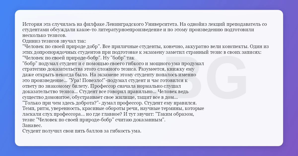 История эта случилась на филфаке Ленинградского Университета. На однойиз лекций преподаватель со студентами обсуждали какое-то литературноепроизведение и по этому произведению подготовили несколько тезисов. Одиниз тезисов звучал так: "Человек по своей природе добр". Все приличные студенты, конечно, аккуратно вели конспекты. Один из этих допропорядочных студентов при подготовке к экзамену заметил странный тезис в своих записях: "Человек по своей природе-бобр". Ну "бобр" так "бобр" подумал студент и с помощью своего гибкого и мощного ума продумал стратегию доказательства этого сложного тезиса. Разумеется, книжку ему даже открыть некогда было. На экзамене этому студенту попалось именно это произведение... "Ура! Повезло!"-подумал студент и час готовился к ответу по знакомому билету. Профессор сначала нормально слушал доказательство тезиса... Студент все говорил правильно... Человек ведь существо домовитое, обустраивает свое жилище, тащит все в дом... "Только при чем здесь доброта?"- думал профессор. Студент ему нравился. Темп, ритм, уверенность, красивые обороты речи, научные термины, которые ласкали слух профессора... но где главное? И тут звучит: "Таким образом, тезис "Человек по своей природе-бобр" считаю доказанным". Занавес. Студент получил свои пять баллов за гибкость ума.