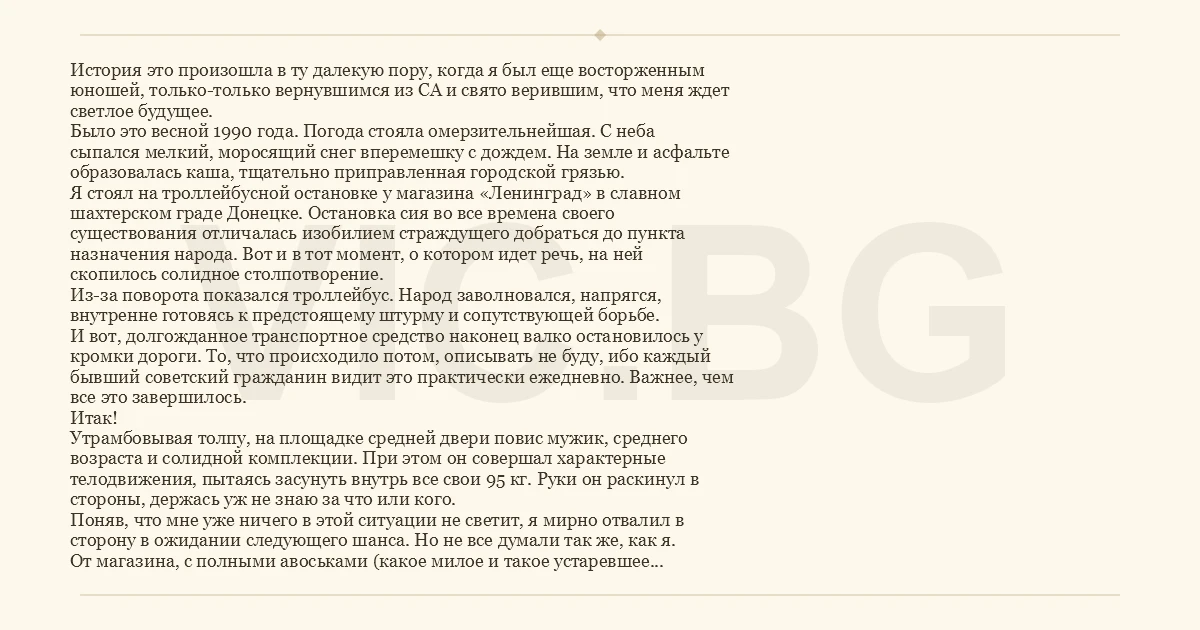 История это произошла в ту далекую пору, когда я был еще восторженным юношей, только-только вернувшимся из СА и свято верившим, что меня ждет светлое будущее. Было это весной 1990 года. Погода стояла омерзительнейшая. С неба сыпался мелкий, моросящий снег вперемешку с дождем. На земле и асфальте образовалась каша, тщательно приправленная городской грязью. Я стоял на троллейбусной остановке у магазина «Ленинград» в славном шахтерском граде Донецке. Остановка сия во все времена своего существования отличалась изобилием страждущего добраться до пункта назначения народа. Вот и в тот момент, о котором идет речь, на ней скопилось солидное столпотворение. Из-за поворота показался троллейбус. Народ заволновался, напрягся, внутренне готовясь к предстоящему штурму и сопутствующей борьбе. И вот, долгожданное транспортное средство наконец валко остановилось у кромки дороги. То, что происходило потом, описывать не буду, ибо каждый бывший советский гражданин видит это практически ежедневно. Важнее, чем все это завершилось. Итак! Утрамбовывая толпу, на площадке средней двери повис мужик, среднего возраста и солидной комплекции. При этом он совершал характерные телодвижения, пытаясь засунуть внутрь все свои 95 кг. Руки он раскинул в стороны, держась уж не знаю за что или кого. Поняв, что мне уже ничего в этой ситуации не светит, я мирно отвалил в сторону в ожидании следующего шанса. Но не все думали так же, как я. От магазина, с полными авоськами (какое милое и такое устаревшее слово!!! )) к троллейбусу на приличной скорости неслась дама бальзаковского возраста и рубенсовской наружности. Весом так кг на 110. Подлетев к дверям средней площадки, она, не издав не звука, схватила дергающегося мужичка за ворот куртки и резко дернула. Мужичок, не ожидавший нападения с тыла, отпустил опору и плашмя грянулся в то, что находилось на асфальте, то бишь, в омерзительную, грязную кашу. Дама тут же заняла его место и, повернув к нему голову, философски изрекла: - Ну что же вы, мужчина? Мне же тоже ехать надо. Мужичок от сего оборота потерял дар речи и лежал в грязи пару минут, пока троллейбус, не закрыв двери, стал отъезжать от остановки. Придя в себя, он вскочил и дико матерясь побежал возле троллейбуса, но шанс был упущен. На остановке раздался такой взрыв смеха, что стоявший на противоположной стороне гаишник даже обиделся, подумал видно, что смеются над ним.