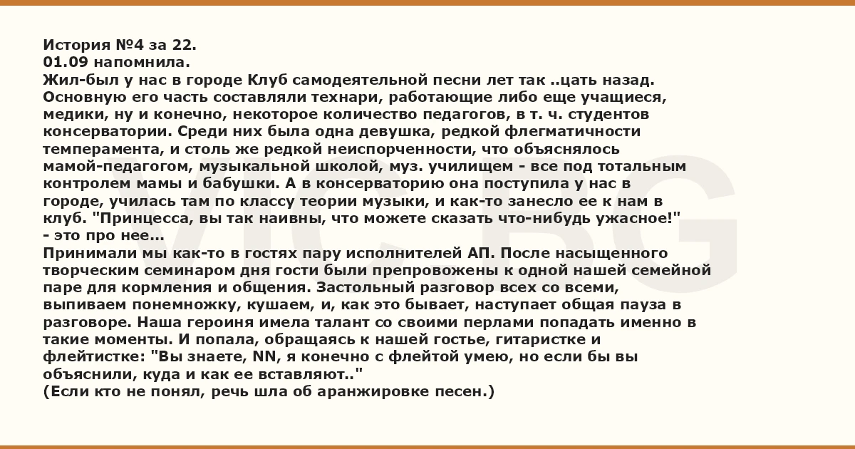 История №4 за 22. 01.09 напомнила. Жил-был у нас в городе Клуб самодеятельной песни лет так ..цать назад. Основную его часть составляли технари, работающие либо еще учащиеся, медики, ну и конечно, некоторое количество педагогов, в т. ч. студентов консерватории. Среди них была одна девушка, редкой флегматичности темперамента, и столь же редкой неиспорченности, что объяснялось мамой-педагогом, музыкальной школой, муз. училищем - все под тотальным контролем мамы и бабушки. А в консерваторию она поступила у нас в городе, училась там по классу теории музыки, и как-то занесло ее к нам в клуб. "Принцесса, вы так наивны, что можете сказать что-нибудь ужасное!" - это про нее... Принимали мы как-то в гостях пару исполнителей АП. После насыщенного творческим семинаром дня гости были препровожены к одной нашей семейной паре для кормления и общения. Застольный разговор всех со всеми, выпиваем понемножку, кушаем, и, как это бывает, наступает общая пауза в разговоре. Наша героиня имела талант со своими перлами попадать именно в такие моменты. И попала, обращаясь к нашей гостье, гитаристке и флейтистке: "Вы знаете, NN, я конечно с флейтой умею, но если бы вы объяснили, куда и как ее вставляют.." (Если кто не понял, речь шла об аранжировке песен.)