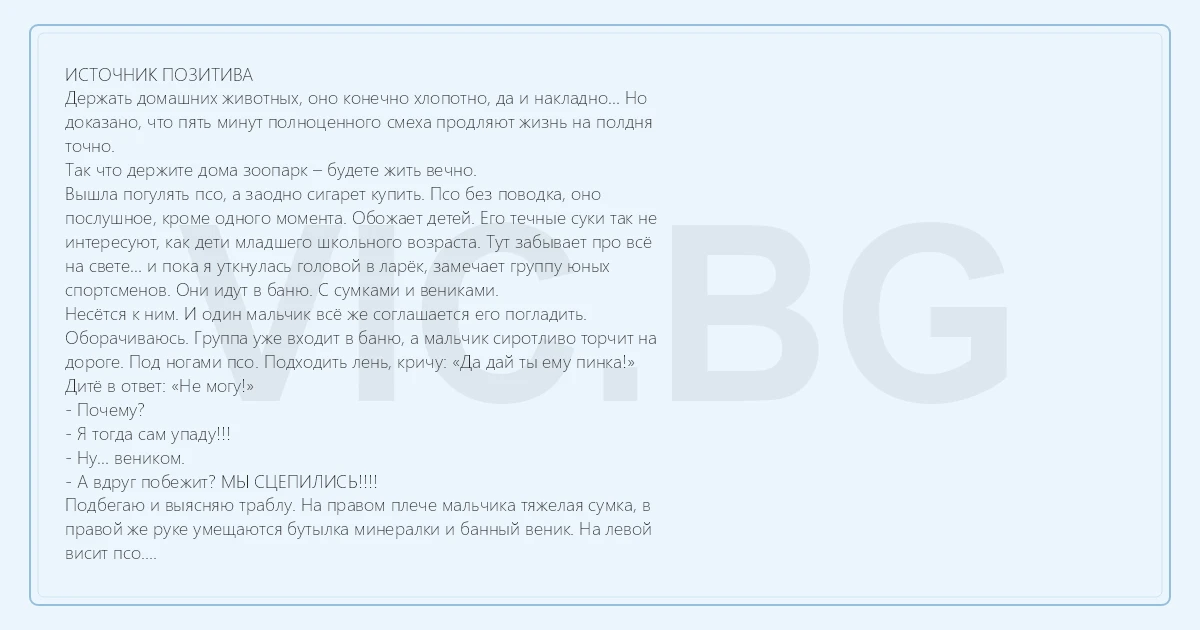 ИСТОЧНИК ПОЗИТИВА Держать домашних животных, оно конечно хлопотно, да и накладно… Но доказано, что пять минут полноценного смеха продляют жизнь на полдня точно. Так что держите дома зоопарк – будете жить вечно. Вышла погулять псо, а заодно сигарет купить. Псо без поводка, оно послушное, кроме одного момента. Обожает детей. Его течные суки так не интересуют, как дети младшего школьного возраста. Тут забывает про всё на свете… и пока я уткнулась головой в ларёк, замечает группу юных спортсменов. Они идут в баню. С сумками и вениками. Несётся к ним. И один мальчик всё же соглашается его погладить. Оборачиваюсь. Группа уже входит в баню, а мальчик сиротливо торчит на дороге. Под ногами псо. Подходить лень, кричу: «Да дай ты ему пинка!» Дитё в ответ: «Не могу!» - Почему? - Я тогда сам упаду!!! - Ну… веником. - А вдруг побежит? МЫ СЦЕПИЛИСЬ!!!! Подбегаю и выясняю траблу. На правом плече мальчика тяжелая сумка, в правой же руке умещаются бутылка минералки и банный веник. На левой висит псо. Дитё с места сдвинуться не может. Ору: «А ну домой!» и уже заношу ногу, чтоб придать псу ускорение, но мальчик жалобно так: - Не бейте его, пожалуйста, он не может домой! И тут вблизи рассматриваю, что же стряслось. На мальчике плотные трикотажные перчатки с оч крепкой липучкой на запястье. Псо ухитрилось когтем прибылого пальца (больше похожего на рыболовный крючок) зацепиться за перчатку. Намертво! Правая рука у пацана занята, поднять пса он не может, нагнуться с сумкой тоже не получается… Расцепляю. Вздох облегчения у обоих был одинаковый. Но ведь ещё и кошка есть. С утра пораньше подходит мама. Глаза как у мальчика, который в своё время спросил: «А что, товарищ Сталин тоже какает?». - Слууушай!! А… кошка может простудиться? Поясняю про то, что простуда – штука универсальная и в определенных условиях может приключиться даже с белым медведем. - А почему ты спрашиваешь? - Она ночью ТАК СТРАШНО чихает!... - Мам, у кошки девять жизней, почихает – перестанет… Ночью иду в туалет. Точнее – возвращаюсь. И слышу из гостиной: - Иии-аАа-ЧуУуУу-ваа-а! ЫЫЫЫ! И это на децибелах взлетающего истребителя. Но к истребителям мы привыкли. У них звук приятнее. Кошке пришлось капать в нос, после чего она сморкалась как пожарный шланг. А я поняла что означало «так страшно чихает». Так что… люди! Держите дома животных! С ними веселее.